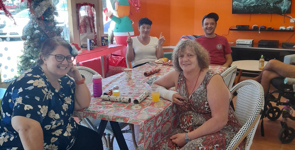Our Sunshine Coast crew gathered at their Hub, with Christmas decorations, music and outfits. They joined tables together to enjoy a beautiful Christmas Lunch prepared Fairies & Mentors. Then they had a surprise visit from Santa and even got given a gift!